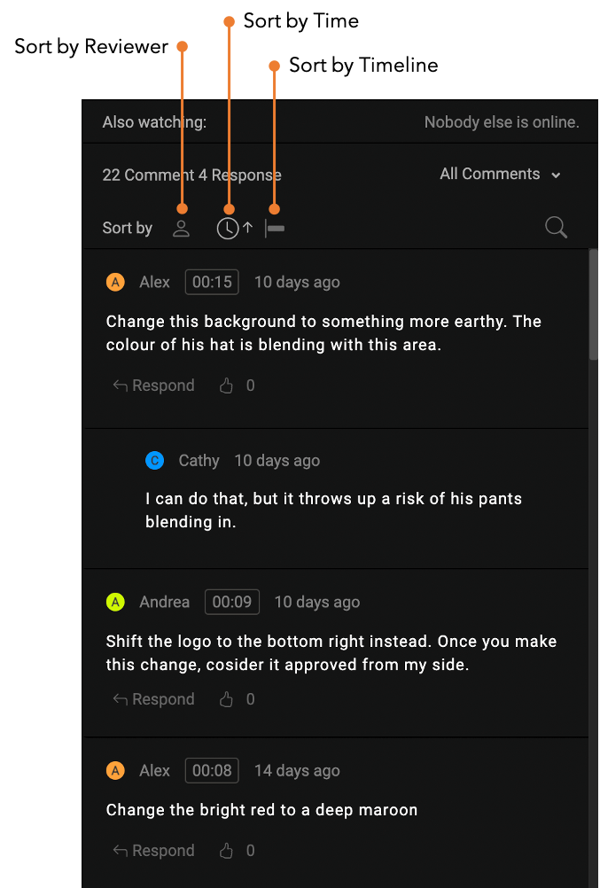 Comments in Videos can be sorted by user, time or video timeline. These three options are just above the right comments panel. Sorting can be done in ascending or descending order.