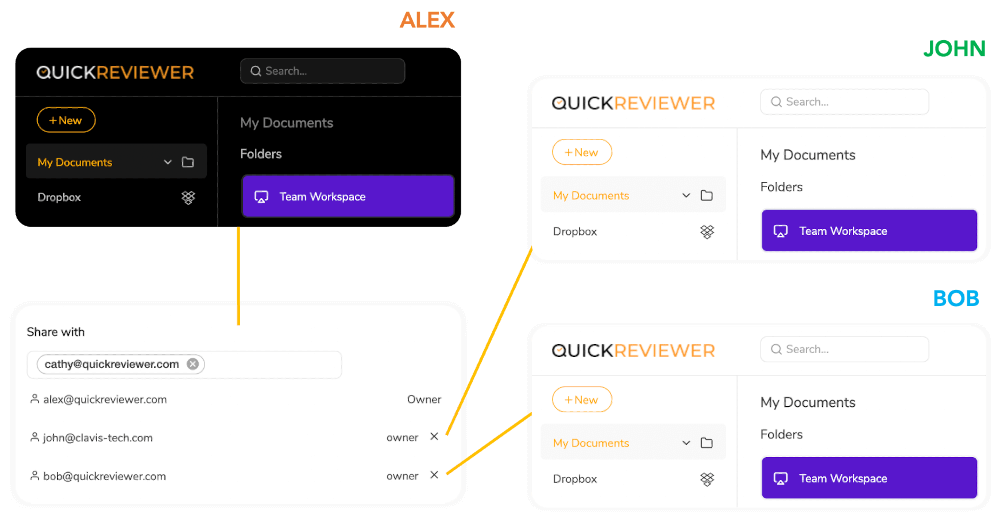 Everyone becomes an owner and has rights to create folders, upload files or revisions and share them with reviewers.