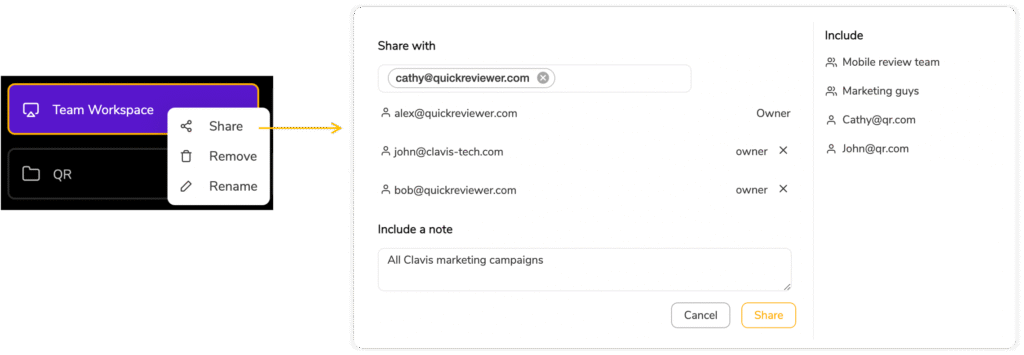 This allows your full team to work on assets in a single place. Use workspaces as campaigns, client names or asset names. You can share multiple Workspaces with multiple users.