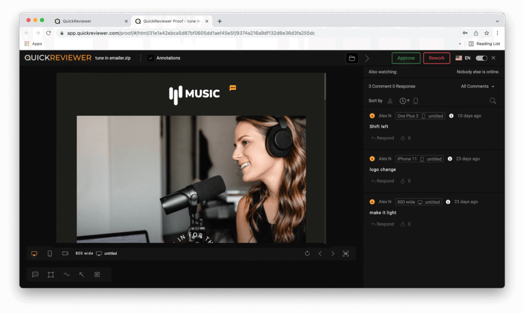 You even get the option to get a real life preview of the file on your mobile phone. A QR code option next to the comment icons in the top bar lets you scan the code using your device camera and load the proof on your mobile device.