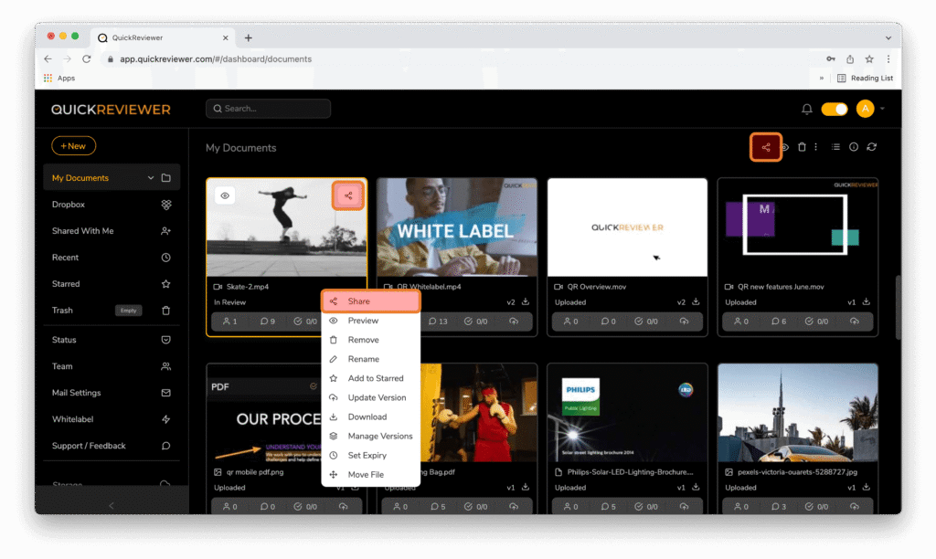 Once you have uploaded files, QuickReviewer gives has a few easy ways to share creatives with reviewers. Select the file, right click or it or simply click the share icon that gets active when you mouse over your creative on the top right corner of the card.