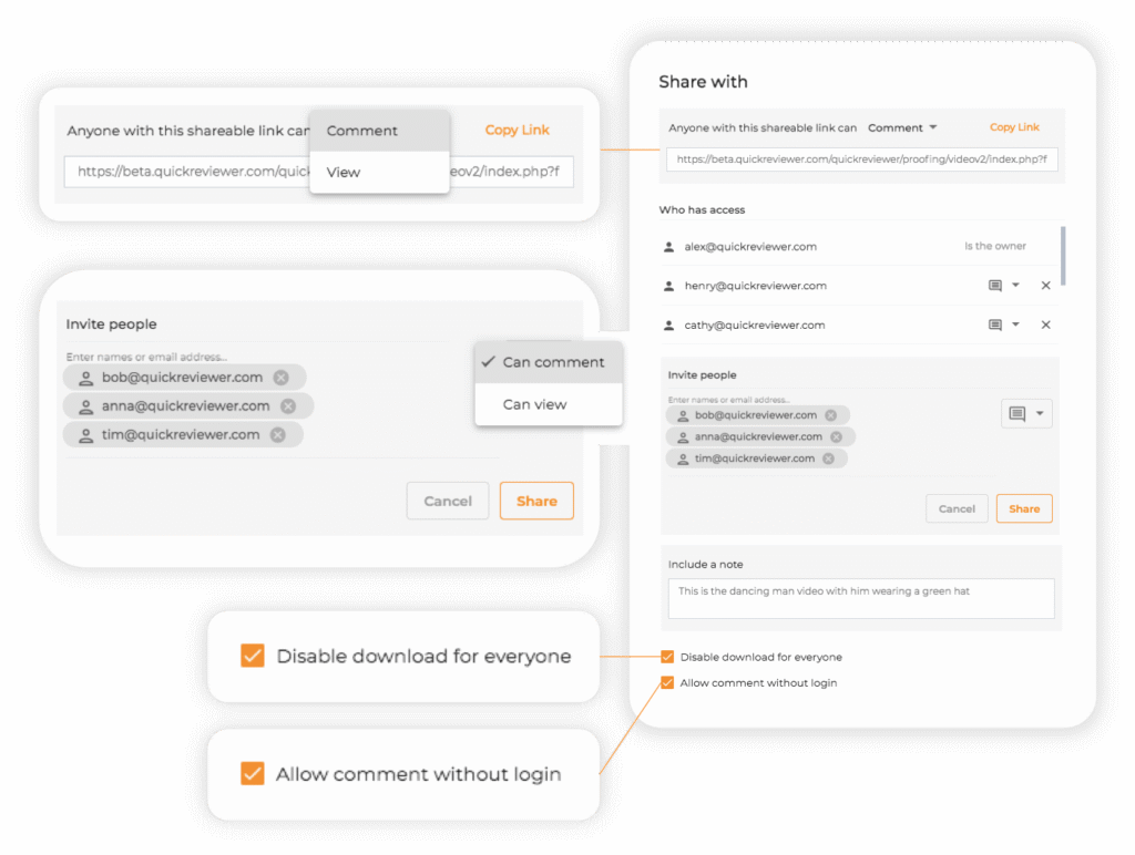1. Get a shareable link that you can copy and share with reviewers for access. Select the Comment or View option depending on the kind of access you wish the link to have. Shareable links allow reviewers to comment without logging in to QuickReviewer. In such cases, all comments are anonymous.