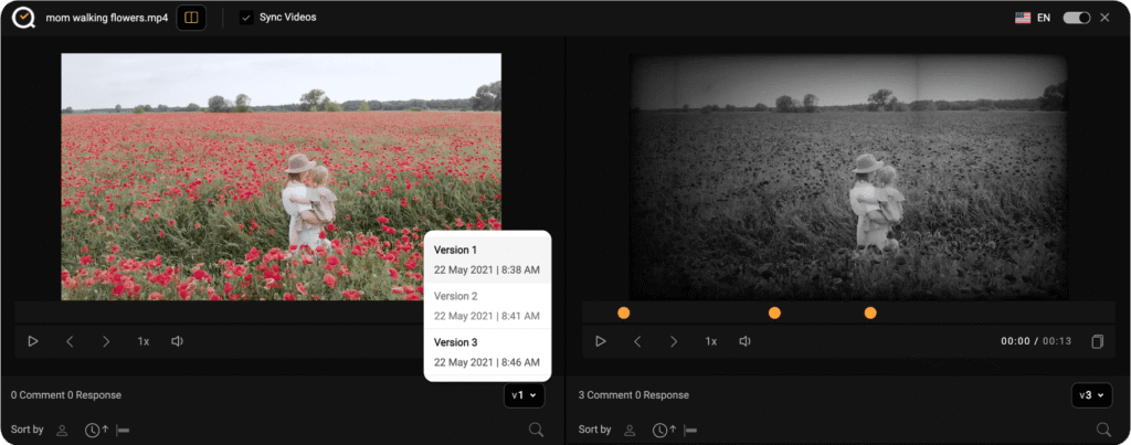 Clicking the compare icon gives you a side by side view of the current version (on the left) and previous version on the right. Changing versions on both sides can be done using the version drop downs at the bottom right corner of each view. The sync option locks the videos timelines or PDF scrolls to each other, making it easier to review files.