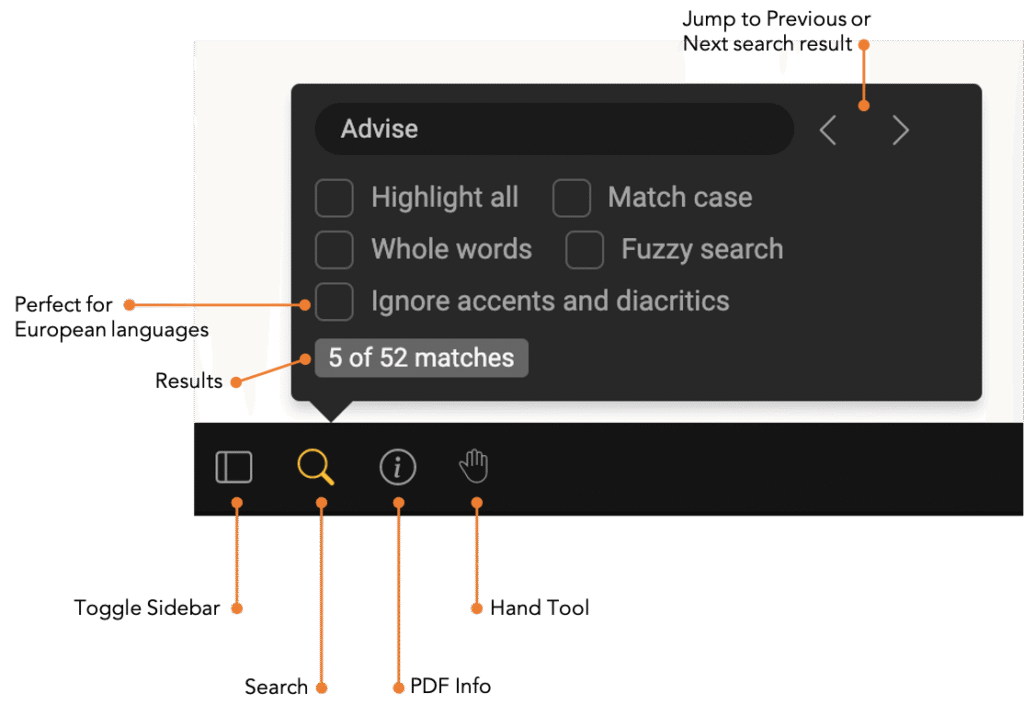 There is also an option to find a phrase or a word from the document using the search icon. Highlight all words, match case or match whole word. Allow fuzzy search and ignore characters with accents (eg. à, ê, ç, ï) and jump between the next and previous searched word.